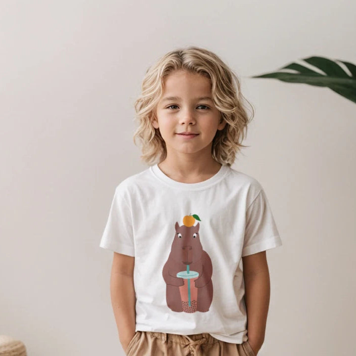 The coolest capybara in town! This t-shirt showcases an adorable capybara taking a refreshing sip of boba tea. A unique and playful design that kids will love to wear.