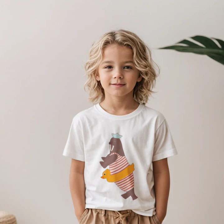 Make a splash with our Walrus Floaty tee! This adorable design features a jolly walrus keeping afloat in style with a cute duck floaty around its waist. Made with super soft fabric, it's perfect for little ones who love animals and silly fun.